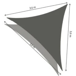 De schaduwdoek driehoek donkergrijs van Orange85 creëert een verkoelende schaduwplek in de tuin. Je bevestigt de doek eenvoudig aan drie punten op de gewenste plek, zoals bijvoorbeeld boven de buiten tafel. De waterafstotende beschermt tevens ook tegen UV-stralen, wind en natuurlijk regen. De doek heeft een afmeting van 3,6 x 3,6 x 3,6 meter. BELANGRIJK: Er wordt geen bevestiging set geleverd bij dit product.