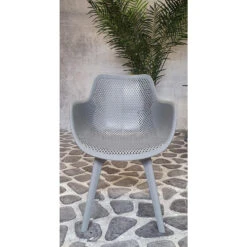 Deze tuinstoel van kunststof is volledig onderhoudsvrij en kan het hele jaar door buiten blijven staan. De kuipvormige zitting is comfortabel en dankzij de perforatie ook luchtig op warme dagen.